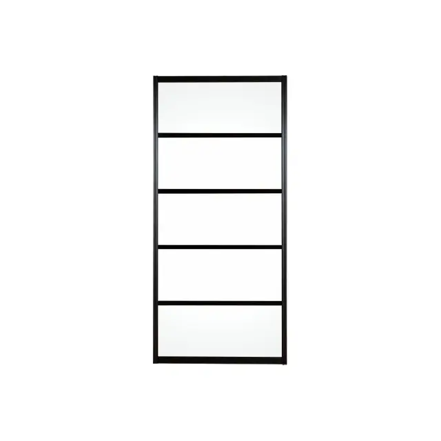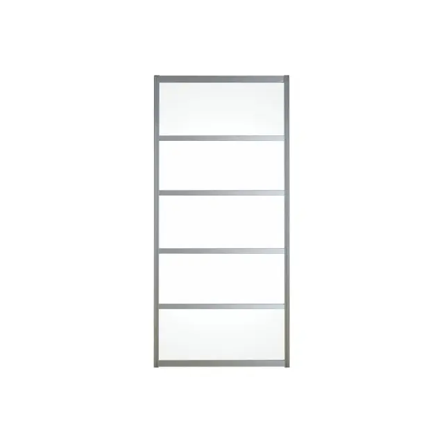 アルミ引き戸「アルマジ」。昼は明るく開放感のある、さわやかな空間を、夜はとなりの部屋から薄明りがもれる、おしゃれで落ち着いた空間を演出します。面倒な枠(敷居・鴨居)の工事は不要。お部屋のイメージが格段に変わります。 上質なアルミフレームと樹脂パネルによるシャープなデザインで、お部屋をアートな空間にします。 5分割に均等に分かれた窓はエレガントな印象を与え、お部屋をアートな空間にし、 クラシックなインテリアにもモダンなスタイルにも柔軟に対応可能。パネル部分は、モダンな空間にフィット、店舗やオフィスにもぴったりの「透明パネル」を使っています。