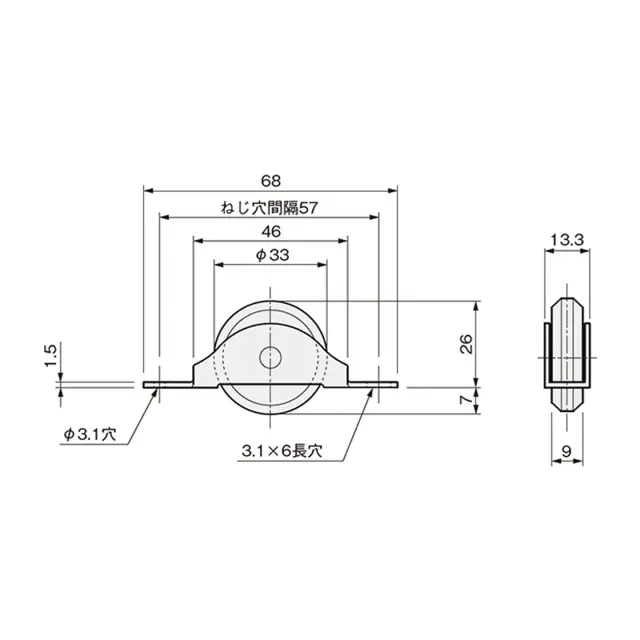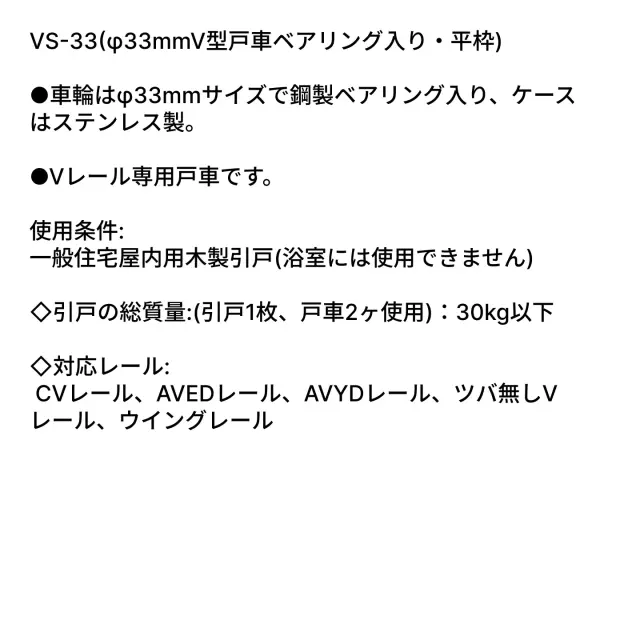 VS-33は、一般住宅屋内用木製引戸に使用するφ33mm V型戸車です。車輪は鋼製ベアリング入りで、Vレール専用戸車です。